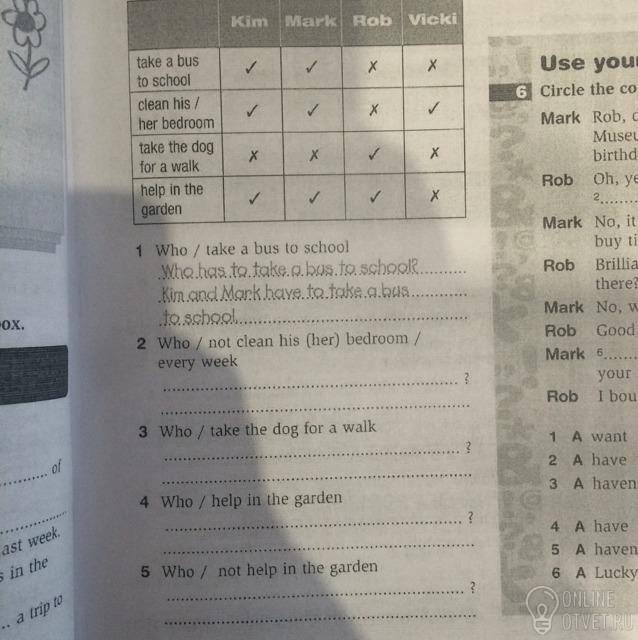 2)Who has not to clean his bedroom every week? Rob has not clean his bedroom every week. 3)Who has to take the dog for a walk? Rob has to take the dog for a walk. 4) who has to help in the garden? Kam, Mark and Rob have to help in the garden. 5) who has not to help in the garden? Vicki has not to help in the garden.