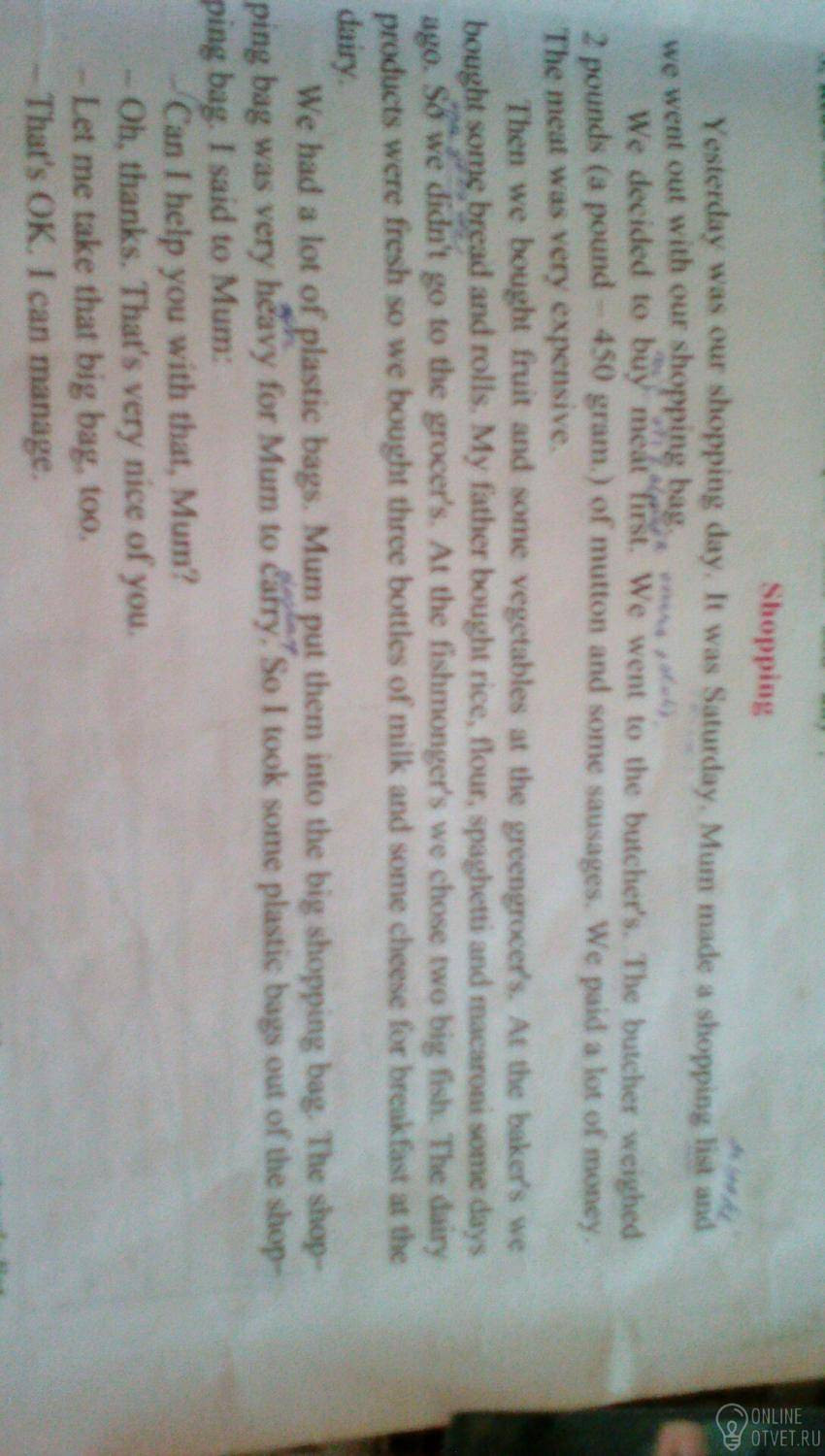 Мы решили сперва купить мясо. Мы пошли к мяснику. Мясник взвесил 2 фунта (1 фунт- 450грамм.) баранины и несколько сосисок. Мы заплатили много денег. Мясо было очень дорогое.