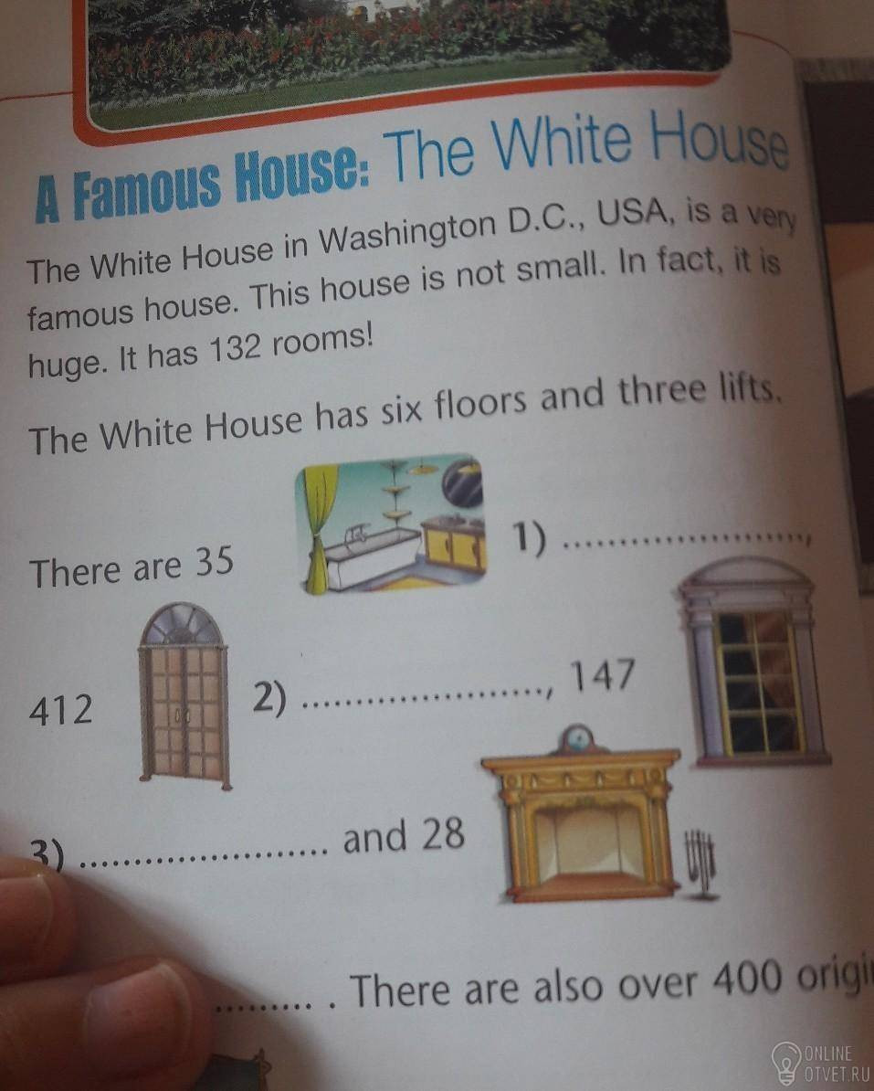 Белый Дом в Вашингтоне, США, является очень знаменитым домом. Этот дом не маленьких размеров. На самом деле, он просто огромный. В нем находится 132 комнаты! В белом доме есть три этажа и три лифта. (А дальше нужно просто выполнить задание. То есть дописать вместо очек нужные слова на английском).
