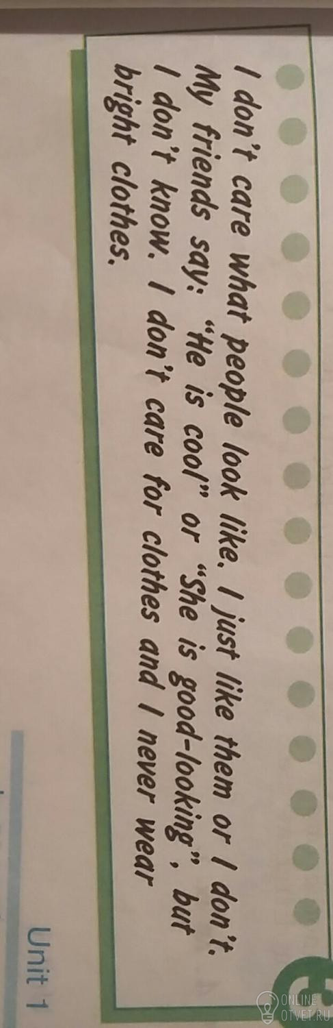 Меня не волнует, как выглядят люди. Они мне просто либо нравятся, либо нет. Мой друг сказал : "Он крутой" или "Она хорошо выглядит", но я не знаю.Меня не волнует одежда, и я никогда не надену яркую одежду