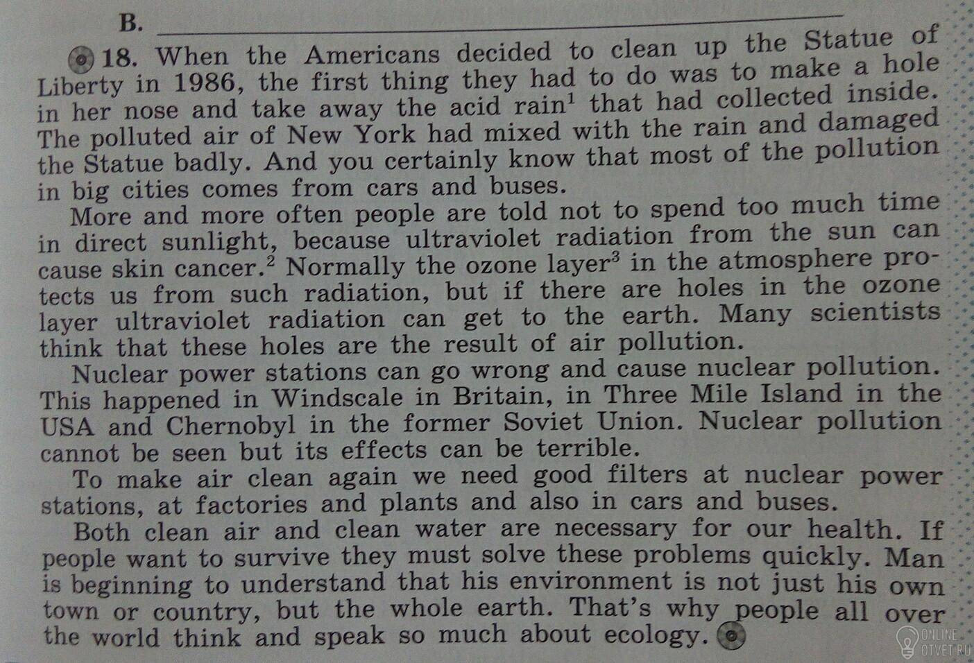 18. Когда американцы решили очистить статую o Liberty в 1986 году, первое, что они должны были сделать, чтобы сделать дыру, было в ее озере кислотный дождь, который проник в нее. ncse и поврежденный Загрязненный воздух Нова смешался с дождем и статуей. И вы наверняка знаете, что большая часть загрязнения в крупных городах происходит от автомобилей и автобусов. Все чаще и чаще говорят не тратить слишком много времени больше людей на прямой солнечный свет, потому что ультрафиолетовое излучение солнца может вызвать рак кожи. Обычно озоновые слои в атмосфере защищают нас от такого излучения, но если в озоновом слое есть дыры, ультрафиолетовое излучение может попасть на Землю. Многие ученые считают, что эти отверстия являются результатом загрязнения воздуха. Атомные электростанции могут ошибаться и вызывать ядерное загрязнение. Это произошло в Windscale в Британии, на острове Три Майл в США и в Чернобыле в бывшем Советском Союзе. Ядерное загрязнение не может быть опасным, но его последствия могут быть ужасны. Чтобы снова очистить воздух, мы использовали фильтры на атомных электростанциях, на заводах и заводах, а также в автомобилях и автобусах. Как чистый воздух, так и чистая вода являются важными для нашего здоровья. Если люди хотят выжить, они должны быстро решить эти проблемы. Человек начинает понимать, что его окружение - это не только его собственный город или страна, поразивший всю землю. Вот почему люди во всем мире думают и так много говорят об экологии.