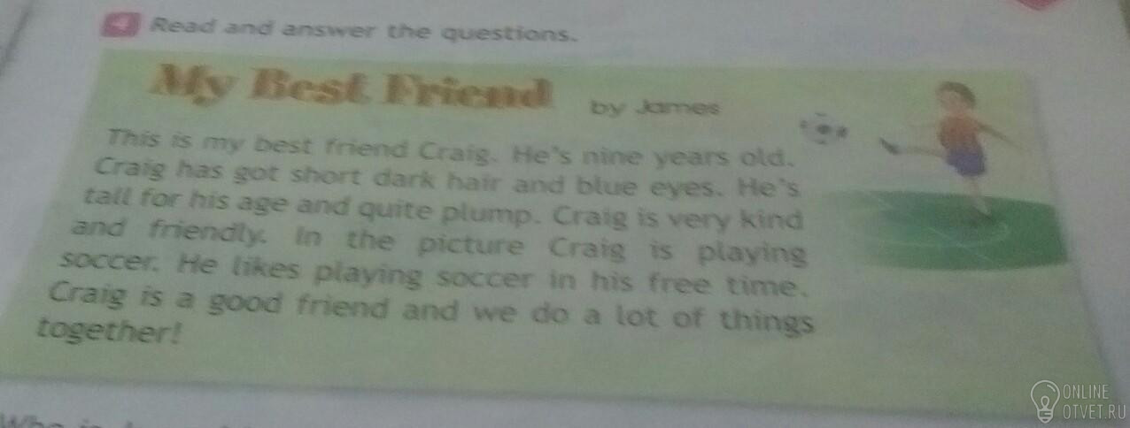 Это мой лучший друг Крэйг(Зис ис май бэст фрэнд Крэйг).Ему девять лет(Хис найн иарс олд).У Крэйга короткие тёмные волосы и голубые глаза(Крэйг хэс гот шот дак хэир энд блю айс).Он высокий для cвоего возраста и довольно пухлый(Хис тол фо хис эйдж и квайт пламп).Крэйг очень добрый и дружелюбный(Крэйг вери кайнд энд фрэндли).На картинке Крэйг играет в футбол.(Ин зе пикче Крэйг ис плэин соке).Он любит играть в футбол в своё свободное время(Хи лайкс плэин соке ин хис фри тайм).Крэйг хороший друг и мы делаем много вещей вместе(Крэйг ис э гуд фрэнд энд ви ду э лот оф финс тугезе)...Надеюсь правильно поняла))