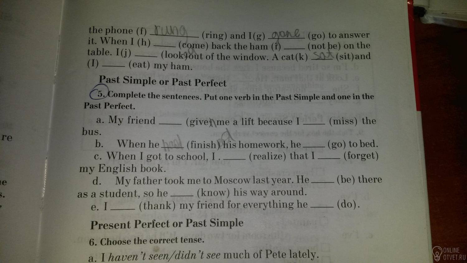 A - gave, missed, b - finished, went, c - realized, forgot, d - was, knew, e - thanked, did.