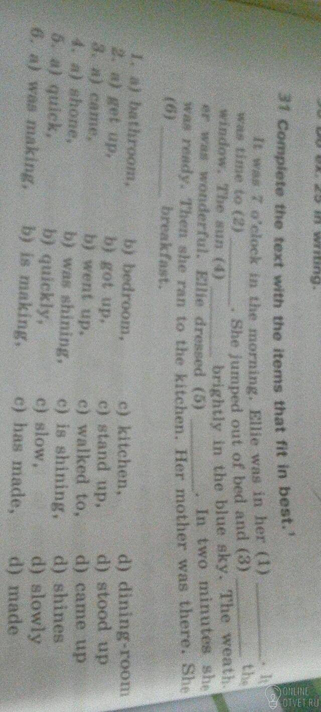 Это было 7 часов утра. Элли была в её ____. пришло время____. она прыгнула из кровати и ____ и окно. солнце ___ ясно на синем небе. погода была удивительной. элли одела ___. через две минуты она стала готовой. она пошла на кухню. её мама была там. она ___ завтрак