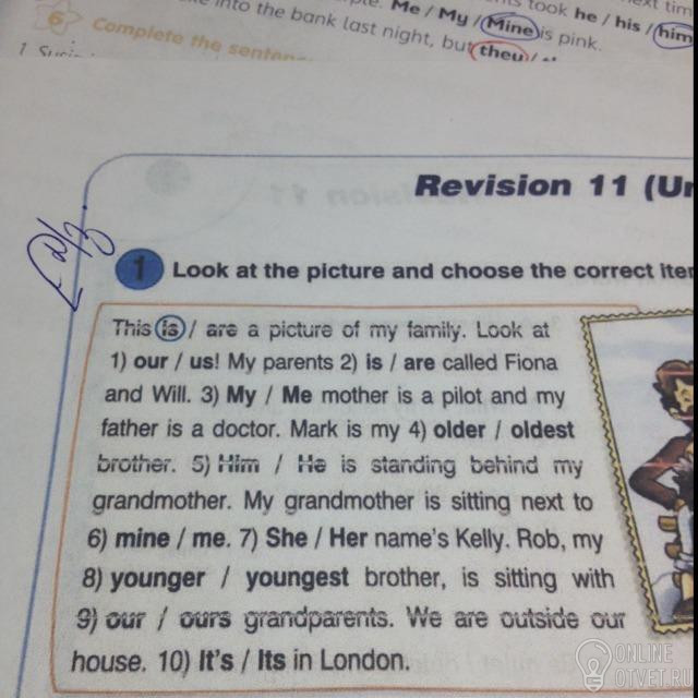 Look at us!My parents are called Fiona and Will.My mother is a pilot and my father is a doctor.Mark is my oldest brother.He is standing behind my grandmother.My grandmother is sitting next to me.Her name's Kelly.Rob,my younger brother,is sitting with our grandparents.It's in London.