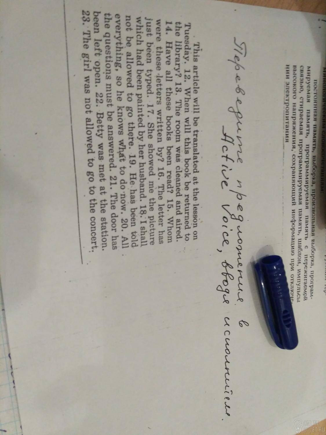 Эта статья будет переведена на уроке во вторник. 12. Когда эта книга будет возвращена в библиотеку? 18. Комната была очищена и проветрена. 14. Прочитали ли все эти книги? 15. Кого писали эти письма? 16. В письме есть только фотография, написанная ее мужем. 18. Мне не разрешено туда ехать. 19. все рассказывали, поэтому он знает, что делать сейчас. 20. На все вопросы нужно ответить. 21. Дверь оставлена открытой. 22. Бетти была встречена на станции. 23. Девочке не разрешили пойти на концерт.
