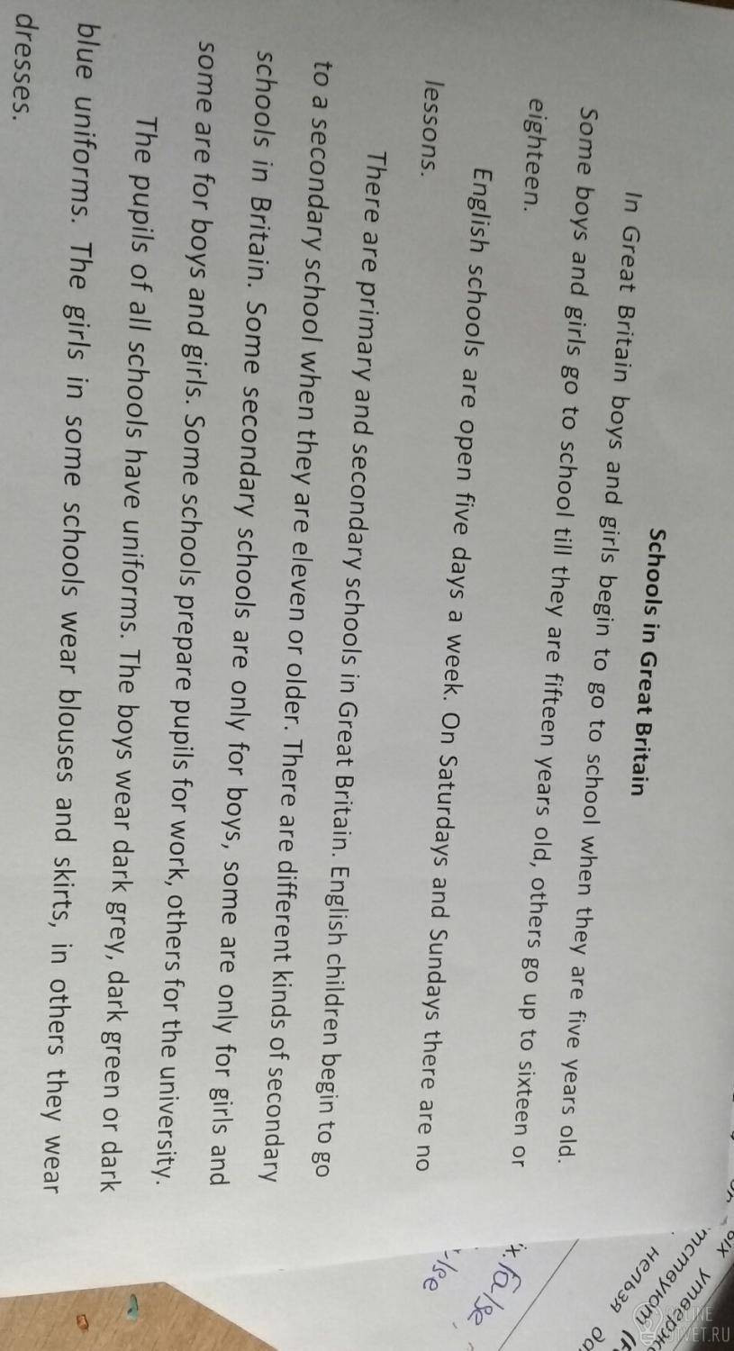 В Великобритании мальчики и девочки начинают ходить в школу когда им исполняется пять лет. Некоторые мальчики и девочки ходят в школу до пятнадцати лет, другие до шестнадцати или восемнадцати. Английские школы открыты пять дней в неделю. В субботу и воскресенье нет уроков. В Великобритании есть начальные и средние школы.Английские дети начинают ходить в среднюю школу когда им исполняется одиннадцать лет или больше. Есть несколько видов средних школ в Британии. Некоторые школы только для мальчиков, некоторые только для девочек и некоторые для мальчиков и для девочек.Одни школы готовять учеников для работы, другие для университета. Ученики всех школ имеют форму. Мальчики носят темно-серую, темно-зеленую или темно-синюю форму.Девочки в некоторых школах носят блузки и юбки, в других школах платья.