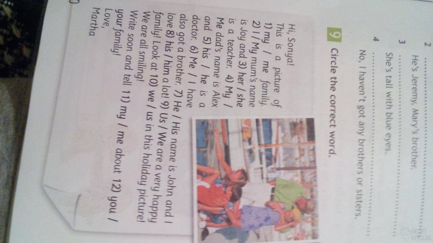 Привет Соня это картинка моей семьи А мою маму зовут Джой и она учительница Моего папу зовут Алекс и он доктор у меня ещё есть брат его зовут Джордж и я его люблю нас счастливая семья посмотри на это мы на каникулах на этой фотографии мы все улыбаемся напиши мне письмо и расскажи про свою семью с любовью марта