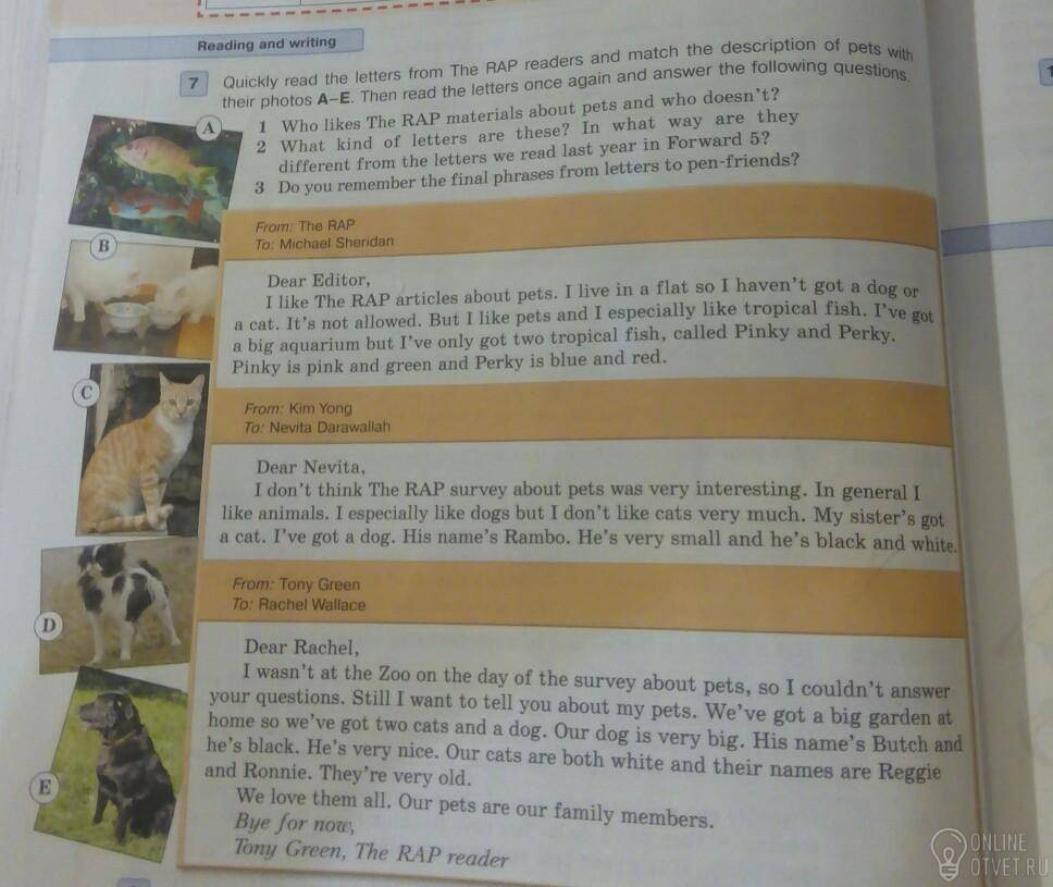 Быстро прочитай письма и соотнеси к питомцам на фото А-Е. Прочитай письма ещё раз и ответь на следующие вопросы.(задание)