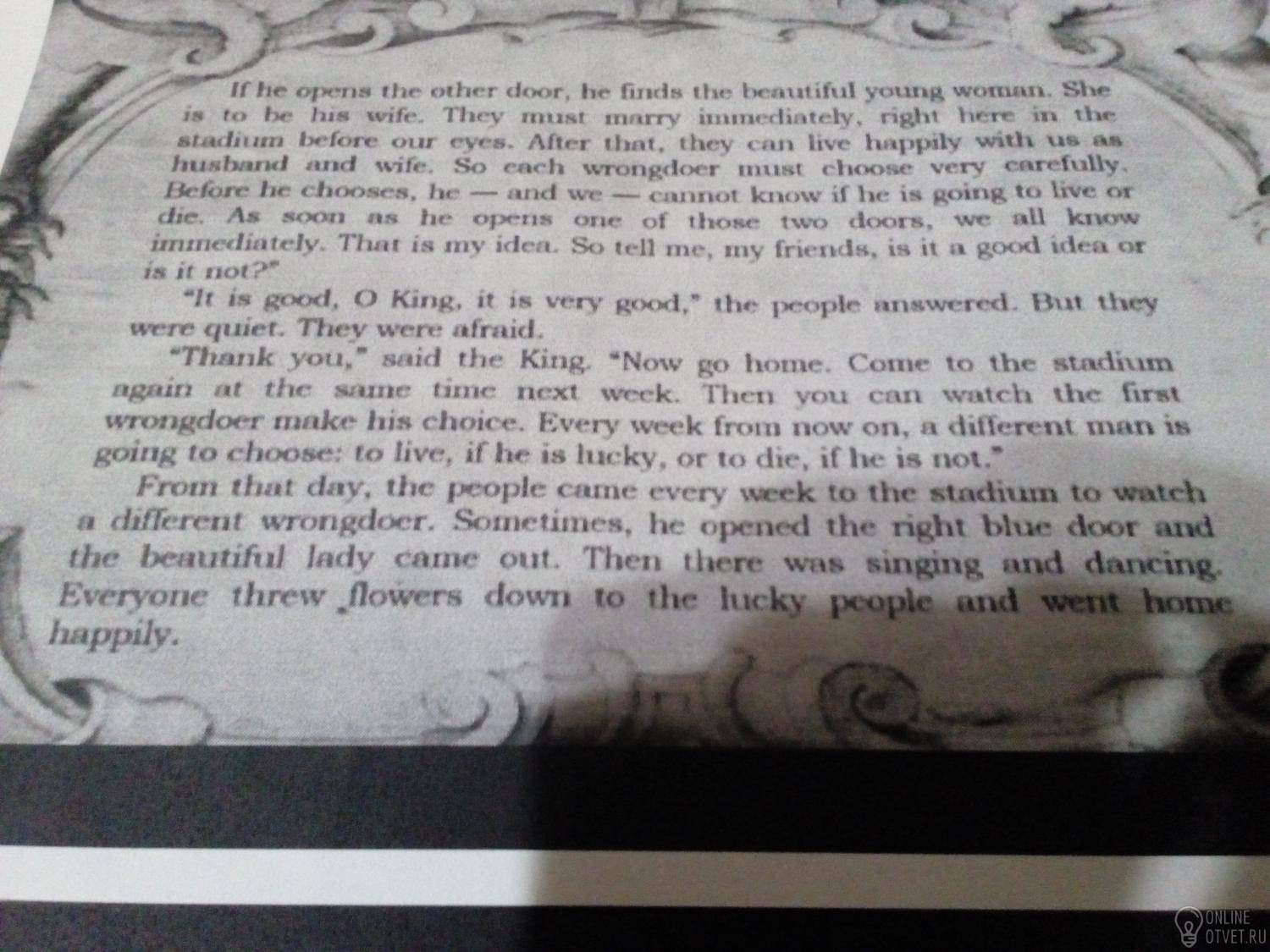 А сейчас, видите две синие двери в дальнем конце стадиона? Возможно, они выглядят абсолютно одинаковыми. Но это не так. За одну из дверей я собираюсь посадить опасное животное, тигра. За второй же будет прекрасная девушка. Нарушитель должен будет выбрать одну из этих дверей. Если откроет не ту дверь, то найдёт тигра. Тот выпрыгнет и убьёт его. Если же откроет другую дверь, то найдёт красивую молодую девушку. Она станет его женой. Они обязаны будут жениться немедленно, прямо здесь, в стадионе, на глазах у всех нас. После этого они смогут жить счастливо с нами в качестве мужа и жены. Так что каждый нарушитель должен будет выбирать крайне осторожно. Перед тем, как выбор будет сделан, он (и мы тоже) не будет знать, будет ли он жить или же умрёт. Как только он откроет одну из дверей, мы сразу же это узнаем. Это моя идея. Что же, скажите мне, друзья мои, хорошая ли это идея или нет?"