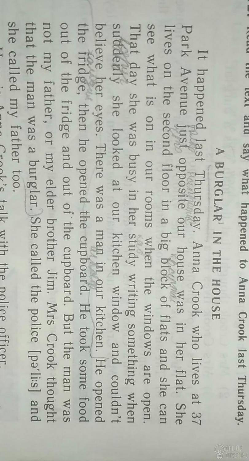 Это случилось в прошлый четверг. Анна Крук (Крюк), которая живёт на Парк Авеню, 37, прямо напротив нашего дома, была в своей квартире. Она живёт на втором этаже большого жилого дома и она может видеть, что происходит в наших комнатах, когда открыты окна. В тот день она была занята в своём кабинете писанием чего-то, как вдруг посмотрела в окно нашей кухни и не смогла поверить своим глазам. В нашей кухне был мужчина. Он открыл сначала холодильник, а потом шкаф. Но тот мужчина не был моим отцом и не был моим братом Джимом. Миссис Крук (Крюк) подумала, что этот мужчина - вор. Она позвонила в полицию и позвонила моему отцу.