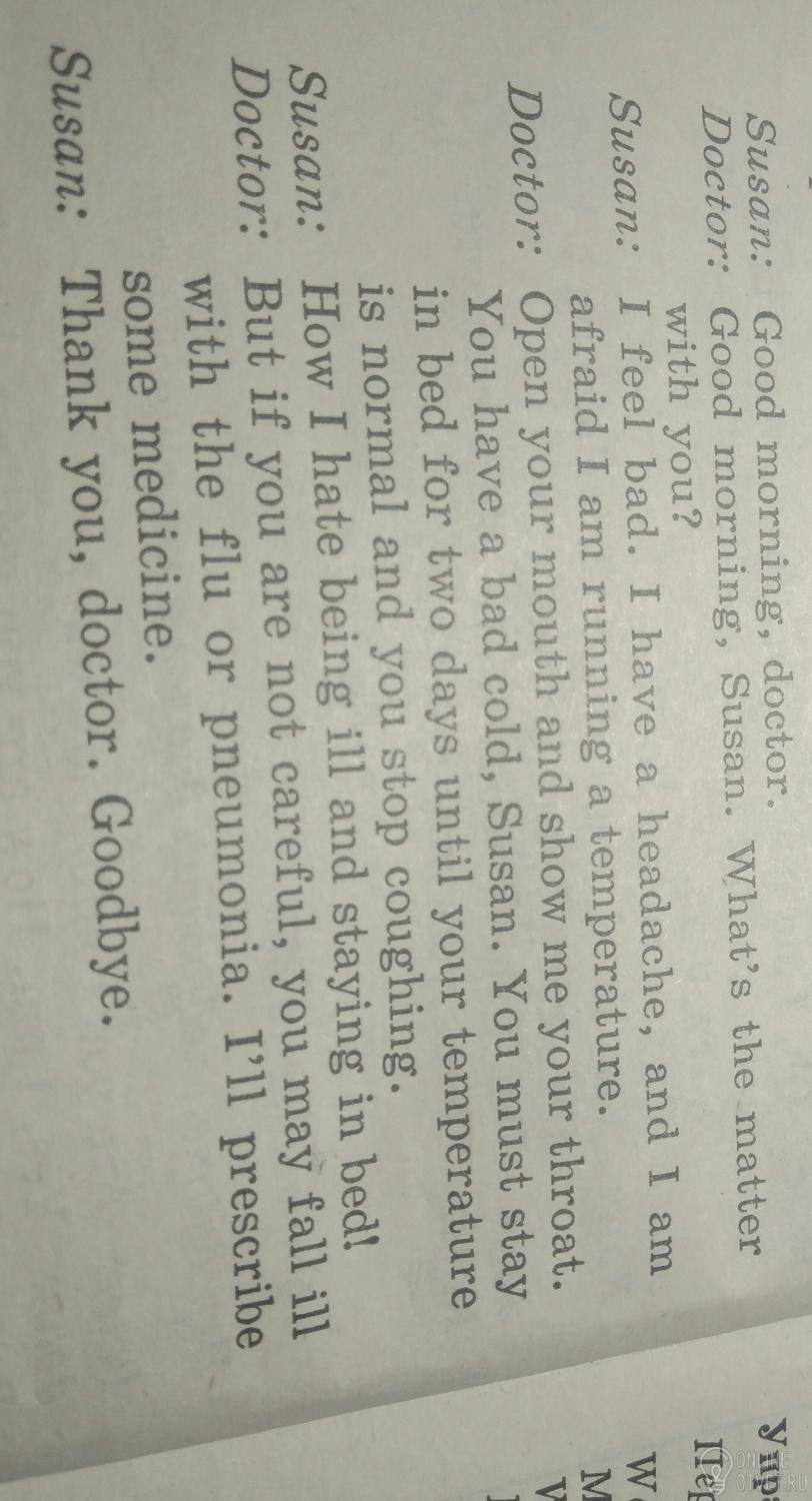 Susan greeted the doctor. The doctor greeted her in return and asked what was the matter with her. Susan answered that she felt bad because she had a headache and added that she was afraid she was running a temperature. The doctor asked Susan to open the mount and to show him her throat. He told Susan that she had a bad cold. The doctor also said that she had to stay in the bed until her temperature was normal and she stopped coughing. Susan exclaimed how she hated being ill and staying in the bed. The doctor replied that if she wasn't careful, she might fall ill with the flu or pneumonia and added that he would prescribe some medicine. Susan thanked the doctor and said goodbye to him.
