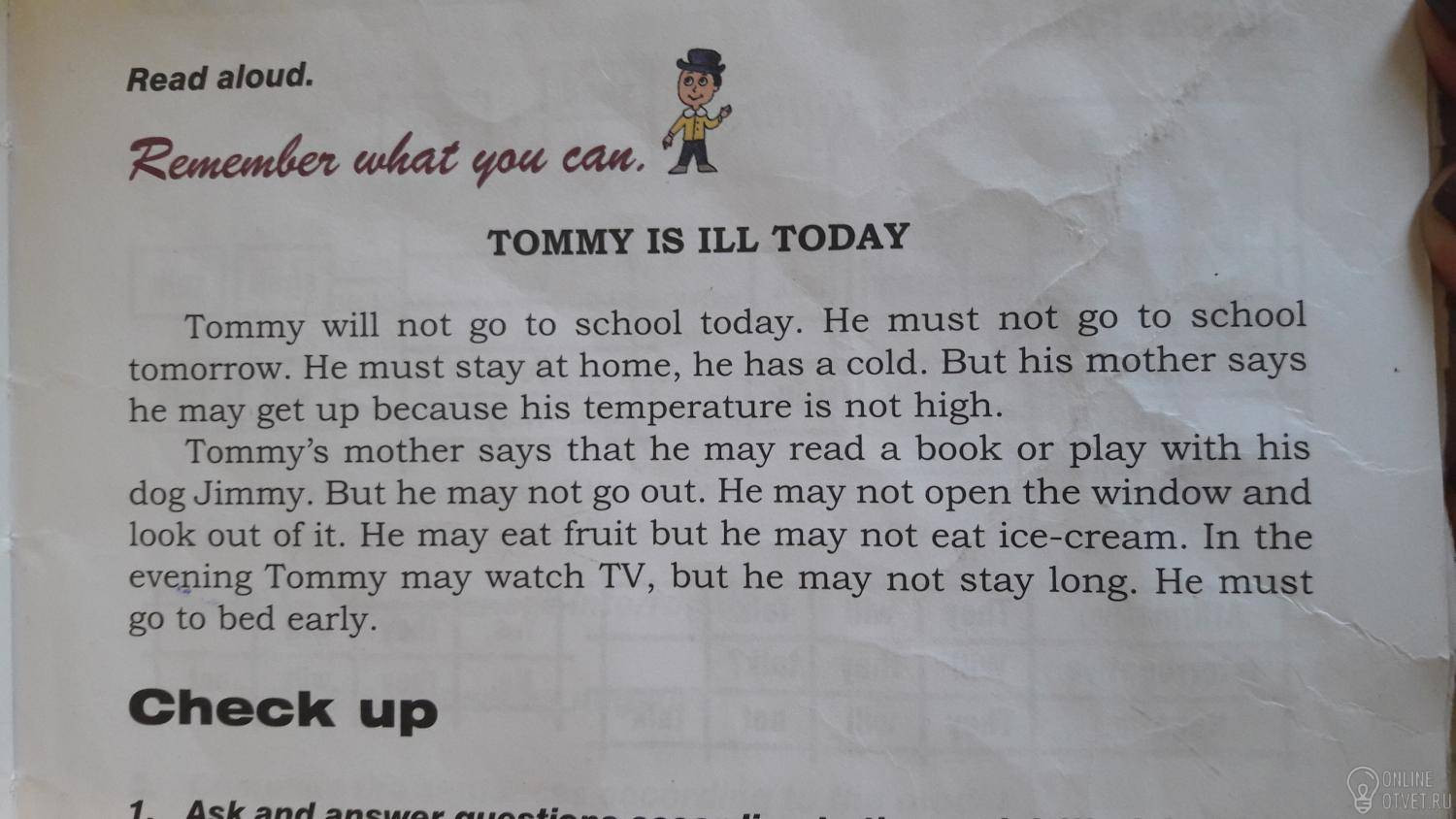 Сегодня Томми не пойдет в школу. Завтра он не должен ходить в школу. Он должен оставаться дома, ему холодно. Но его мать говорит, что он может встать, потому что его температура не высока