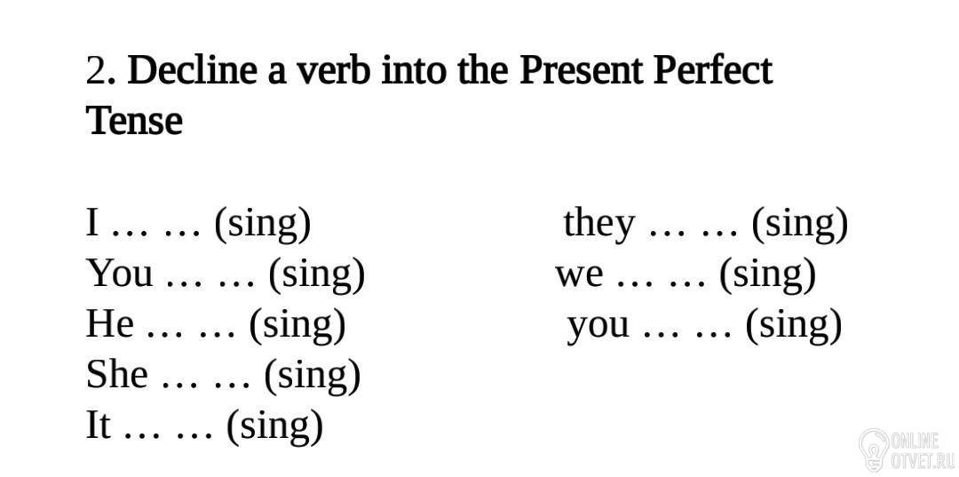 I have sung, You have sung, He has sung, She has sung, It has sung, They have sung, We have sung, You have sung