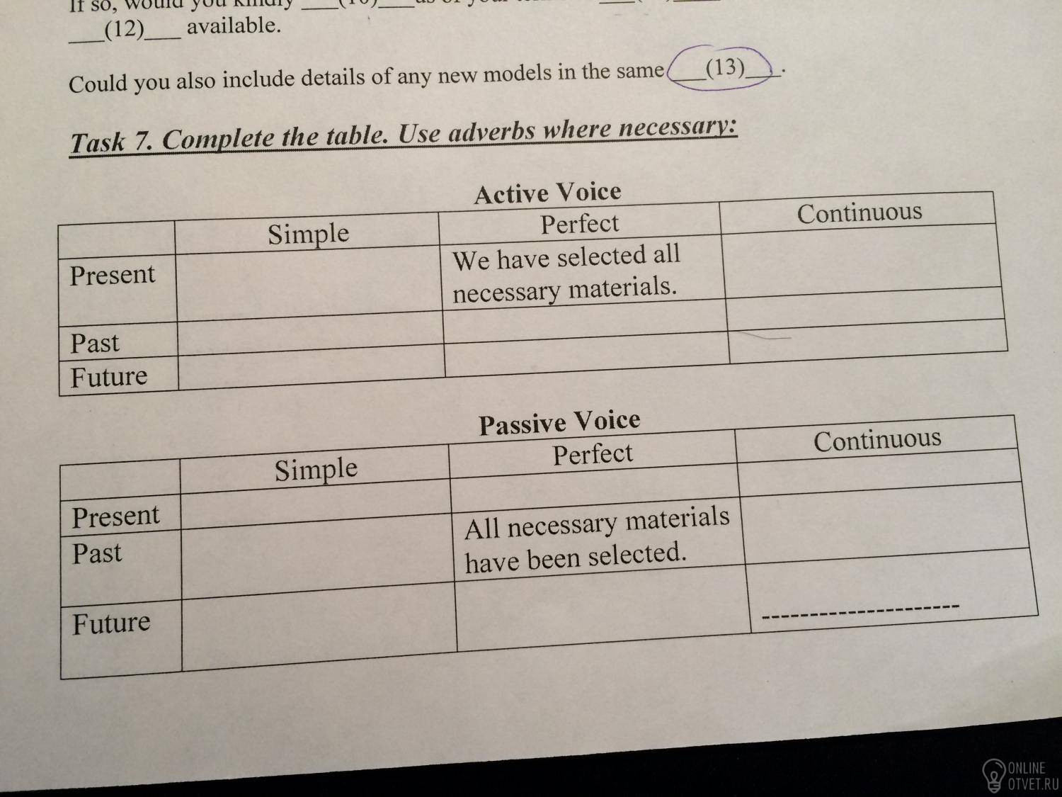 Future Perfect : We will have selected all necessary materials by 7 o'clock tomorrow.