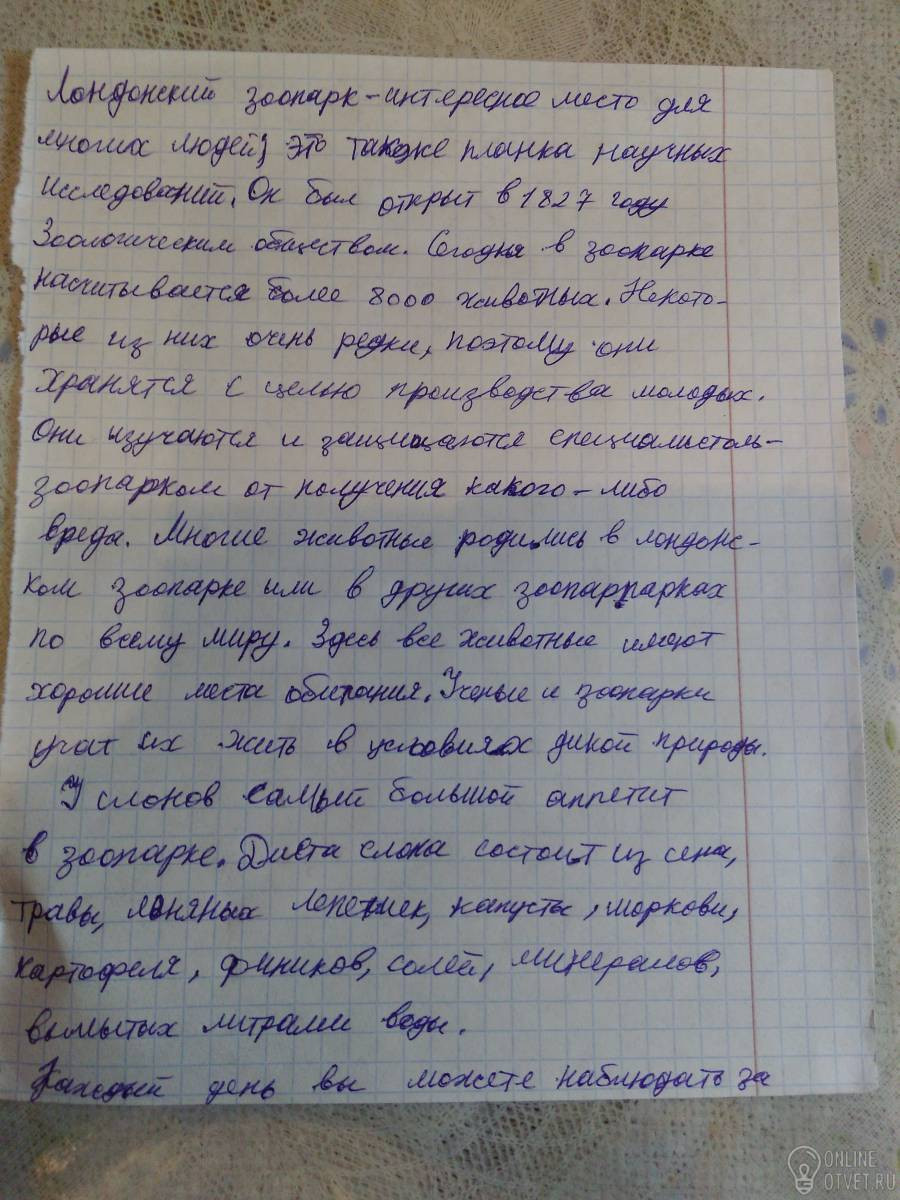 Помогите перевести текст London zoo London Zoo London Zoo is a place of interest for many people; it is also a place of scientific research. It was opened in 1827 by the Zoological Society. Today there are more than 8000 animals in the Zoo. Some are very rare, so they are kept for the purpose of producing young They are studied and protected by zoo specialists from getting any harm. Many animals were born in London Zoo or in other zoos around the World. All animals have good habitats here. Scientists and zoo keepers teach them about wild life conditions. The elephants have the biggest appetite in the Zoo. An elephant's diet consists of hay, grass, linseed cakes, cabbages carrots, potatoes, dates, salt, vitamins and minerals, washed down with 100 liters of water. Every day you can watch animals being fed, for instance snakes, lion and seal