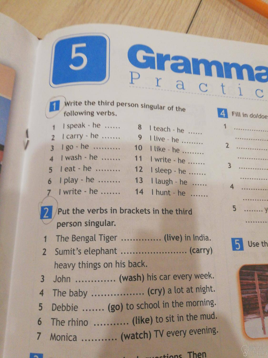 1 I speak-he speaks I carry- he carries I go -he goes I wash-he washes I eat-he eats I play-he plays I write-he writes I teach-he teaches I live-he lives I like-he likes тоже самое I sleep-he sleeps I laugh-he laughs I hunt-he hunts 2 1lives 2carries 3washes 4 cries 5goes 6 likes 7 watches