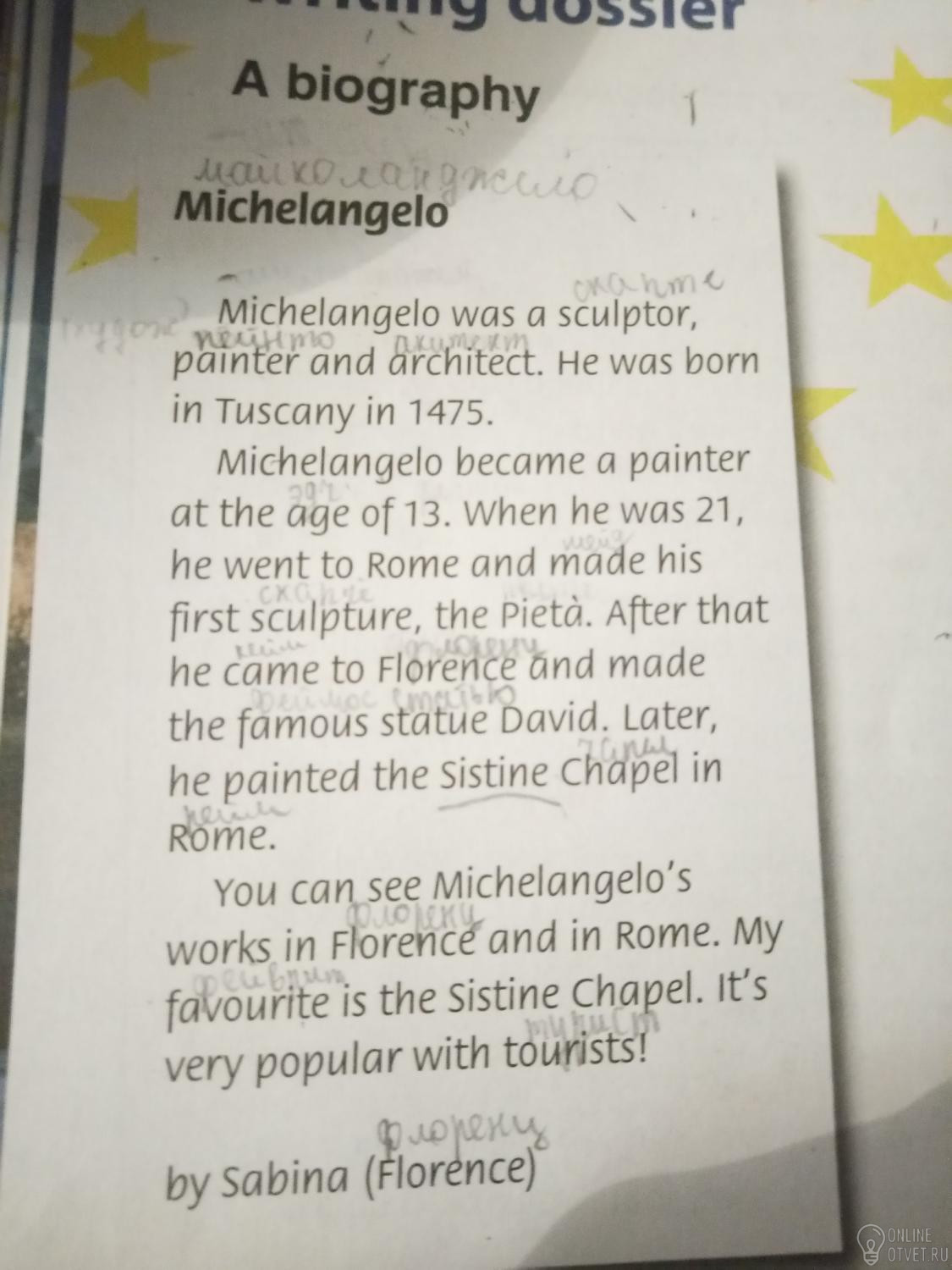 Микеланджело был скульптором, художником и архитектором. Он родился в Тоскане в 1475 году. Микеланджело стал художником в возрасте 13 лет. Когда ему было 21 год, он отправился в Рим и сделал свою первую скульптуру - Пьета. После этого он приехал во Флоренцию и сделал статую Давида. Позже он нарисовал Сикстинскую часовню во мне. Вы можете увидеть мои работы Микеланджело во Флоренции и в Риме. Любимая Сикстинская Часовня Это очень популярно у туристов! Сабиной (Флоренция)