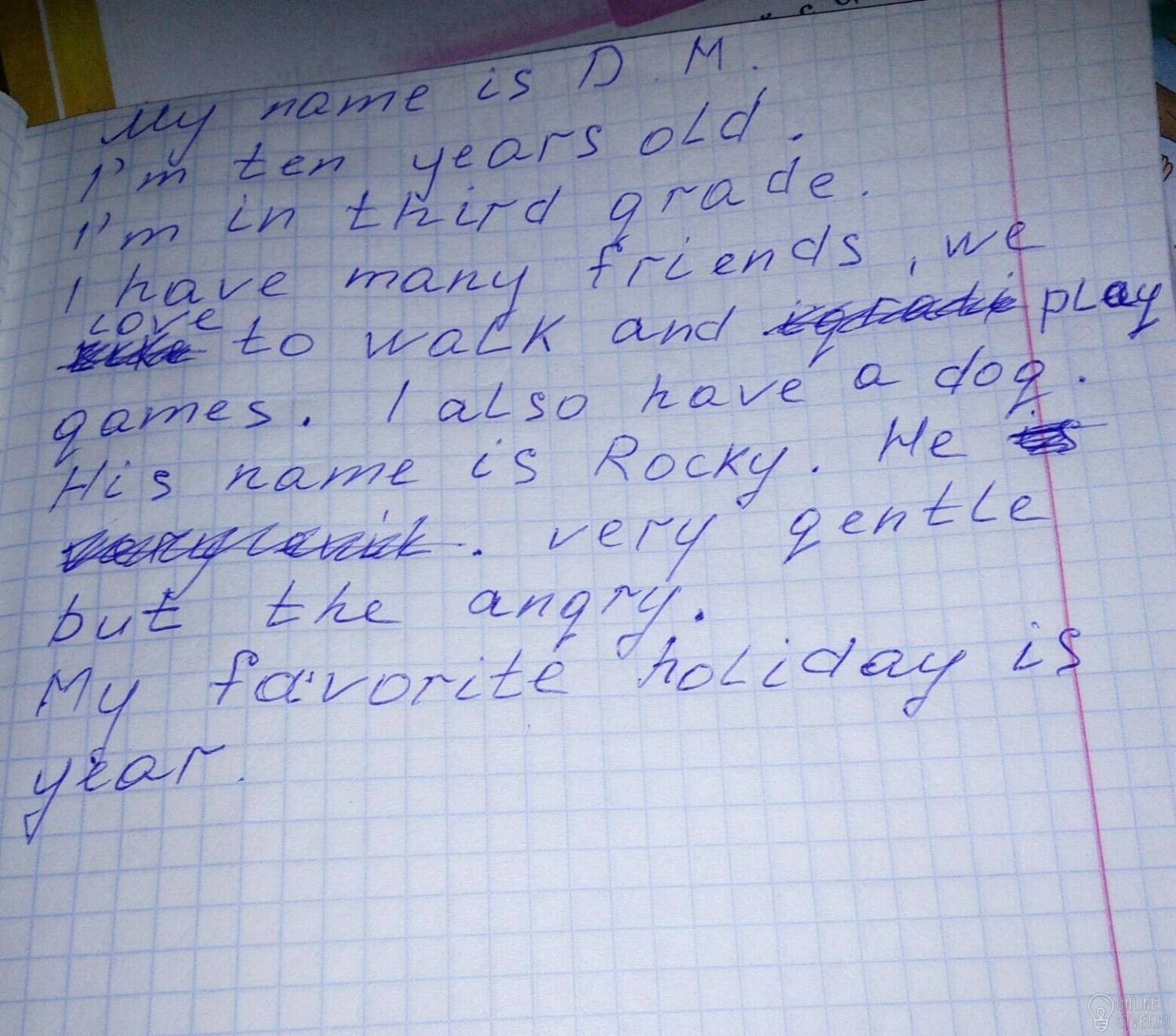Май нейм ис (непонятное что то) Ай эм тен еарс олд Ай эм ин зёрд грэйд Ай хэв мэни френдс ви лов то волк энд плэйс геймс. Ай элсо хэв а дог. Хис нейм ис рокки. Хи верри квент бат зе энгри. Май фаворит холидэейс ис еарс. (в тексте есть небольше ошибки нужен перевод пишите)