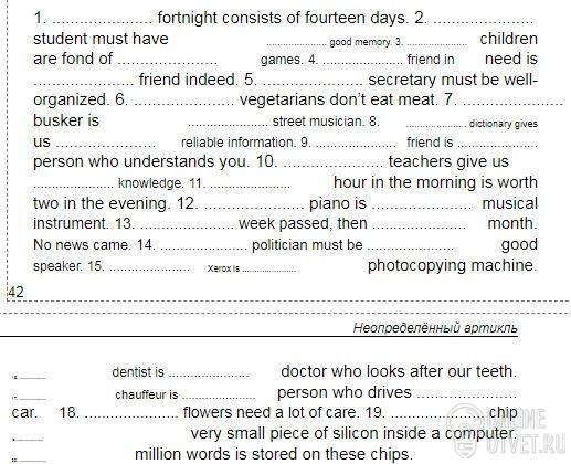 1 A fortnight consists of fourteen days.2 A student must have a good memory.3 Children are fond of playing computer games.4 A friend in need is a friend indeed.5 A secretary must be well-organized.6 Vtgetarians dont eat meat.7 A busker is a street musician.8 A dictionary gives a relitiable information.9 A friend is a person who understand you.10 Teachers give us a knowledge.11 A hour in the morning is worth two in the evening.12 A piano is a musical instrument.13 A week passed, then a month. No news came.14 A politician must be a good speaker.15 Xerox is a photocoping maschine.16 A dentist is a doctor who looks after our teeth.17 A chauffeur is a person who drives a car.18 Flowers need a lot of care.19 A chip is a very small piece of silicon inside a computer.