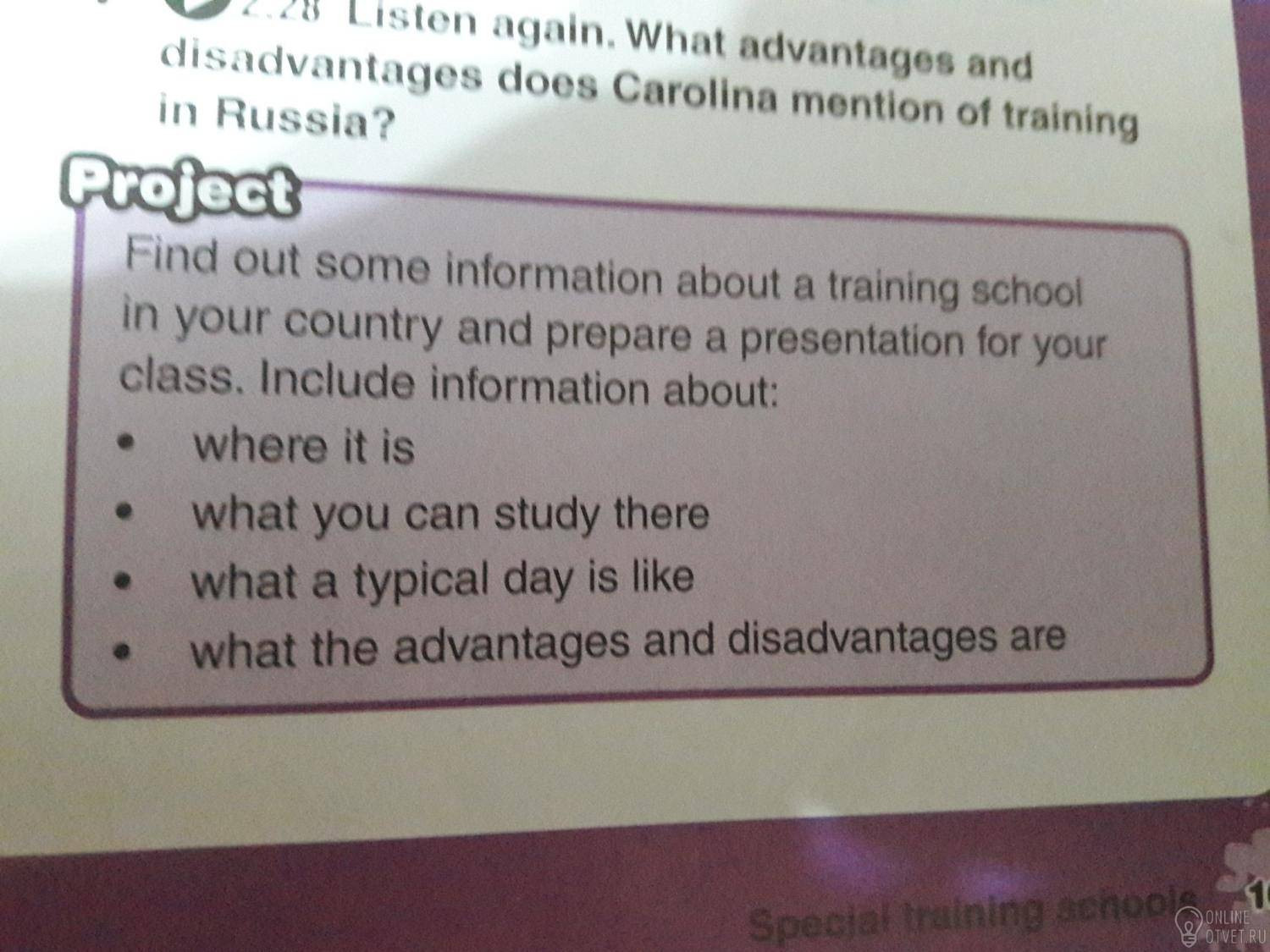 I’d like to tell you about a training school in my country. It’s in Moscow, on Vorobiovy Gory. There, you can learn how to skateboard, snowboard, surf, wakeboard, parkour and freerun. There, day begins at 7 o’clock in the morning, and after breakfast the trainings begin. Then there’s a tasty lunch served and after that there are training sessions, too. In the evenings everyone hang out together and socialize. Bed time starts at 22:00. The advantages are: an opportunity to learn new skills, to find new friends, to learn to be responsible.