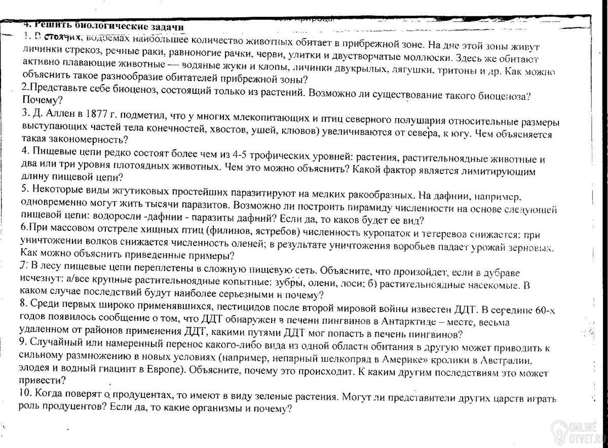 Итак, писать буду много, но все нужно, по-другому никак;))) 1. В прибрежной зоне наблюдается такое явление как биотон или экотон - это переход от среды с одними условиями к среде с другими (в данном случае: граница между сушей и водоемом), это явление создается благодаря наложению одной среды на другую, то есть организмы, обитающие на суше, в водоеме и организмы, обитающие и там и там, образуют единое сообщество, поэтому в прибрежной зоне самое высокое биоразнообразие. 2. Существование биоценоза, состоящего только из растений, невозможно. Пищевых цепей там быть не может, потому что не присутствуют ни консументы, ни редуценты, следовательно существование такого сообщества не возможно. 3. Суть правила Аллена заключается в том, что животные северных широт с уменьшением выступающих частей туловища уменьшают относительную площадь поверхности тела, что способствует экономии тепла. Например: песец, обитающий в холодном климате, имеет короткие лапы, уши, хвост и предплюснутую мордочку, в отличие от своего южного собрата - фенька. 4. Правило Линдемана гласит: на каждый следующий трофический уровень переходит менее 10% энергии, следовательно, чем длиннее трофическая цепь, тем меньше энергии достается следующему звену, если бы существовали цепи из 10 звеньев, например, то последним звеньям вообще не дом