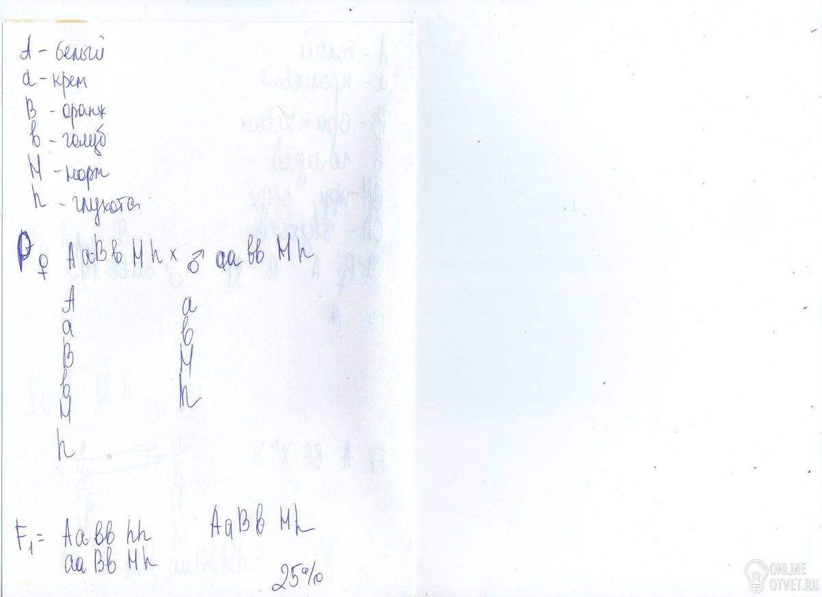 Предположим, что у кошек ген белой окраски шерсти доминирует над геном кремовой окраски, ген оранжевого цвета глаз - над геном голубого цвета глаз и ген нормального слуха - над геном, обуславливающим глухоту. Скрещивали белую кошку с оранжевыми глазами и нормальным слухом с кремовым котом, имеющим голубые глаза и нормальный слух. В результате этого скрещивания в потомстве оказались: а) голубоглазый, белый и глухой котенок, б) слышащий, кремовый котенок с оранжевыми глазами и в) слышащий, белый котенок с оранжевыми глазами. Определить генотипы родителей и вероятность рождения голубоглазых, белых, глухих котят.