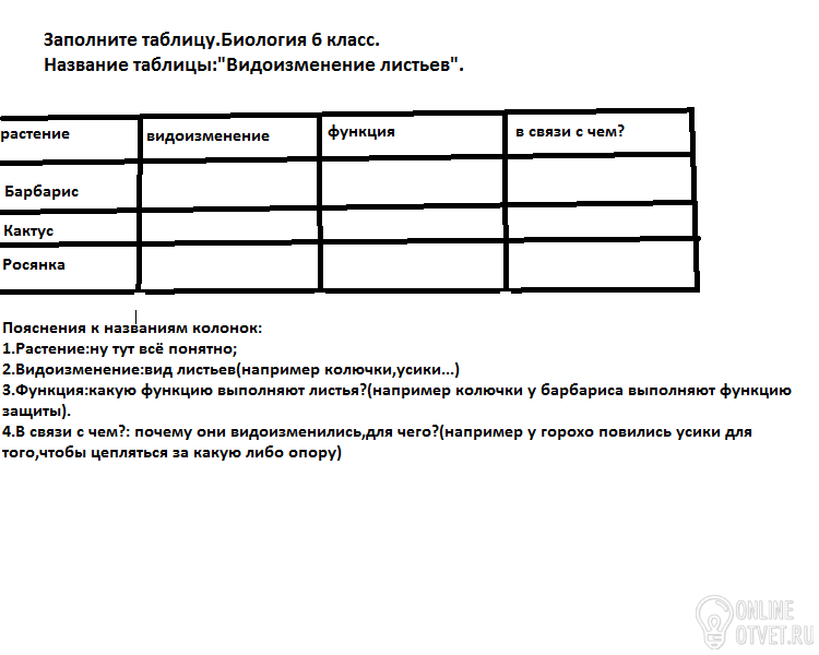 Барбарис- ВИДОИЗМЕНЕНИЕ- лист превратился в колючку, ФУНКЦИЯ- защита, В СВЯЗИ С ЧЕМ- связано с защитой растений от слишком ярких лучей солнца(рассеивание), а также от поедания животными и других повреждений, защита от излишнего испарения. Кактус- ВИДОИЗМЕНЕНИЕ- лист превратился в колючку. ФУНКЦИЯ- конденсация влаги, привлечение опылителей. В СВЯЗИ С ЧЕМ- корневая система кактусов слабо развита, поэтому колючки являются основным органом водоснабжения. У некоторых кактусов колючки могут быть нектароносными. Росянка- ВИДОИЗМЕНЕНИЕ- лист превратился в ловчий аппарат. ФУНКЦИЯ- азотное питание. В СВЯЗИ С ЧЕМ- живет на почвах бедных азотом и минеральными веществами, поэтому приспособилась пользоваться дополнительным питанием за счет поедания словленных насекомых.