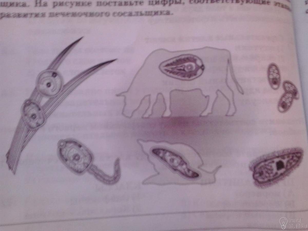печоночный сосальщик гермафродит. его яйца из печени в кишечник хозяина (коровы) потом, с калом, выходят наружу. для своего дальнейшего развития они должны попасть в воду. затем в воде из яйца выходит личинка с ресничками, которая потом проникает в тело моллюска( промежуточного хозяина( в данном случае прудовика)) в его теле личинка растет и размножается, давая ещё несколько личинок следующего поколения. эти личинки выходят из тела прудовика в воду. они плавая в воде при помощи хвоста в конце концов приклепляются к листьям водных растений, покрывается плотной оболочкой цистой. скот заражается печеночным сосальщиком при питье воды или поедании травы с его цистами. в кишечнике циста лопается, молодой сосальщик выходит и проникает в печень....