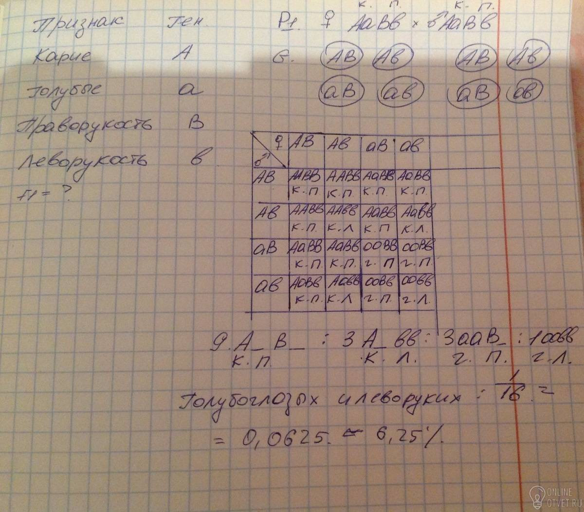 рукой, преобладает над геном, определяющим развитие леворукости.Какова вероятность рождения голубоглазых .леворуких детей от брака двух ди-гетерозиготных родителей?