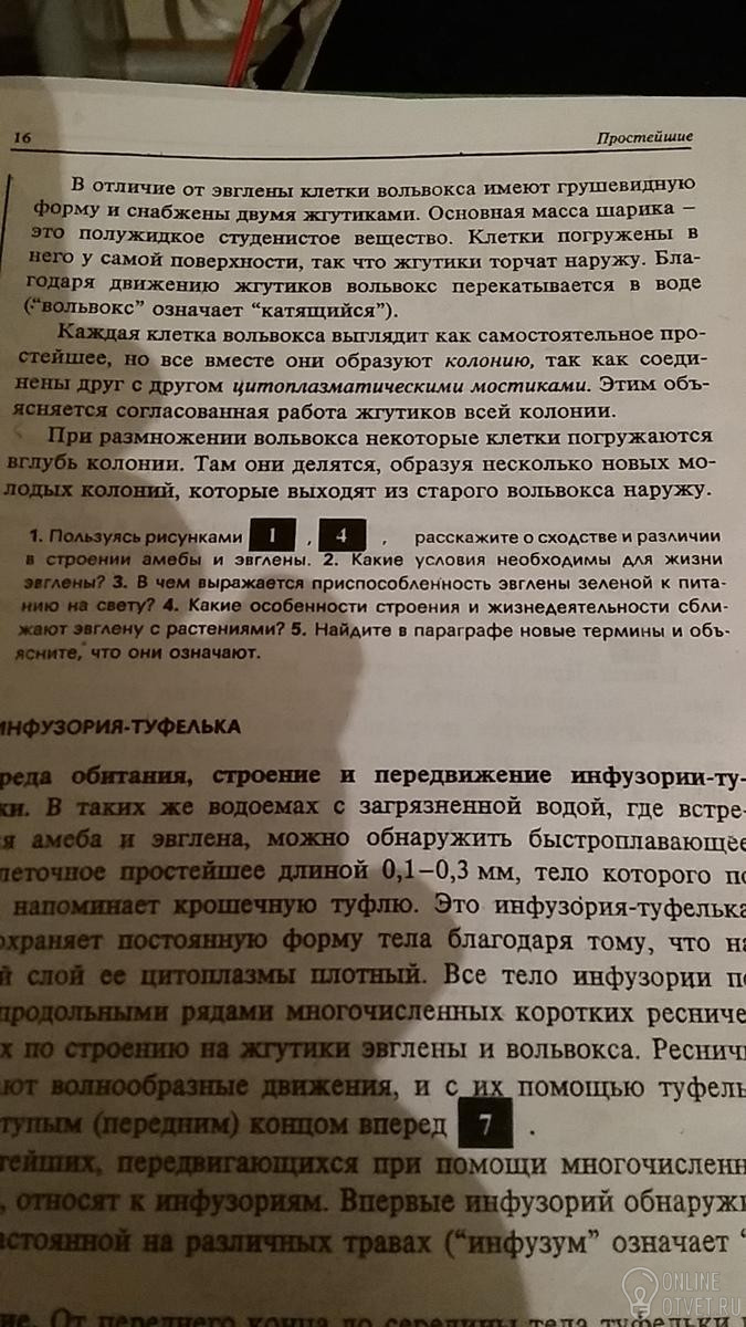 1.Амеба перемещается, образуя на своем теле небольшие выросты и, затем, перемещает туда содержимое цитоплазмы. Получается, что животное перемещается перетеканием. Такие выпячивания на теле амебы называют ложноножками.Эвглена зеленая имеет веретеновидную форму тела, а передвигается с помощью жгутика. Поэтому, в отличие от амебы, скорость передвижения намного больше. Зеленый цвет эвглены обусловлен наличием в цитоплазме хлоропластов. Это значит, что эвглена способна к фотосинтезу. Чтобы двигаться к свету, эвглена имеет такие органеллы как светочувствительный глазок и сократительную вакуоль.