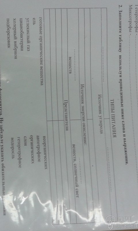 ТИПЫ ПИТАНИЯ: гетеротрофное / автотрофное. ИСТОЧНИК УГЛЕРОДА: Готовые органические вещества / углекислый газ. ИСТОЧНИК ЭНЕРГИИ, ОКИСЛЕНИЕ: Органических веществ / неорганических веществ, солнечный свет. ПРЕДСТАВИТЕЛИ: Холерный вибрион, подберезовик, слон / ель, цианобактерии, водоросль.