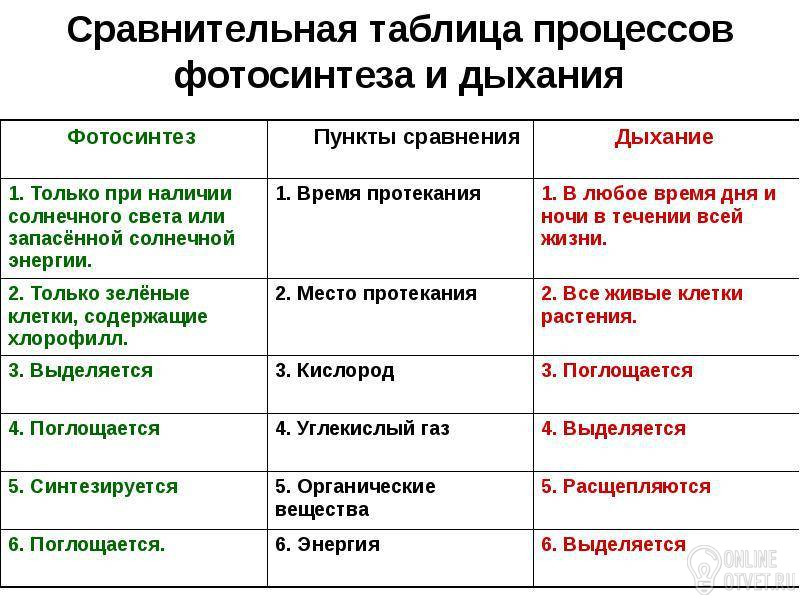 Изучив текстпарафа заполните таблицу <Сравнение процессов фотосинтеза и дыхания >