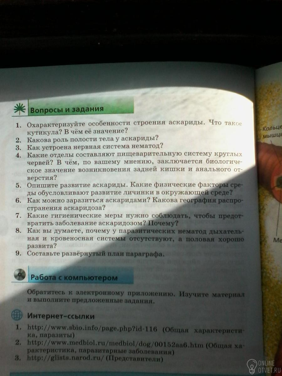 5. попав в желудок обоочка яиц растворяется. червь попадает в печень, потом в сердце, и в лёгкие. там личинка развивается в кислородной среде. далее попадает в глотку и вторично заглатывается. попадает в кишечник и уже может размножаться