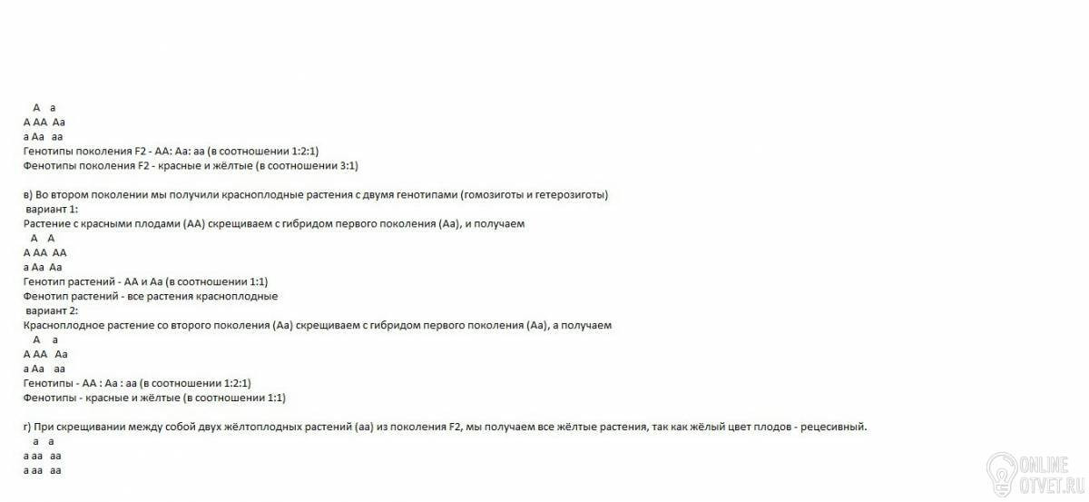 г) При скрещивании между собой двух жёлтоплодных растений (аа) из поколения F2, мы получаем все жёлтые растения, так как жёлый цвет плодов - рецесивный.