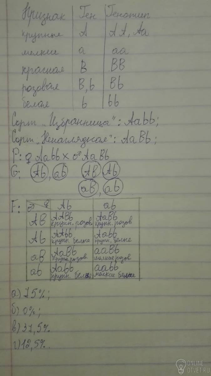 У земляники крупные листья полностью доминируют над мелкими, а наследование окраски плодов носит промежуточный характер: красная окраска доминирует над белой, промежуточный признак- розовые плоды. Гены, контролирующие появление указанных признаков, расположены в разных парах аутосом. Сорт земляники "Избранница" был получен путем скрещивания крупнолистных растений с мелколистными. Затем растения сорта "Избранница", имеющие белые плоды и крупные листья, скрестили с дигетерозиготным сортом "Ненаглядная". Определите вероятность появления среди потомства: