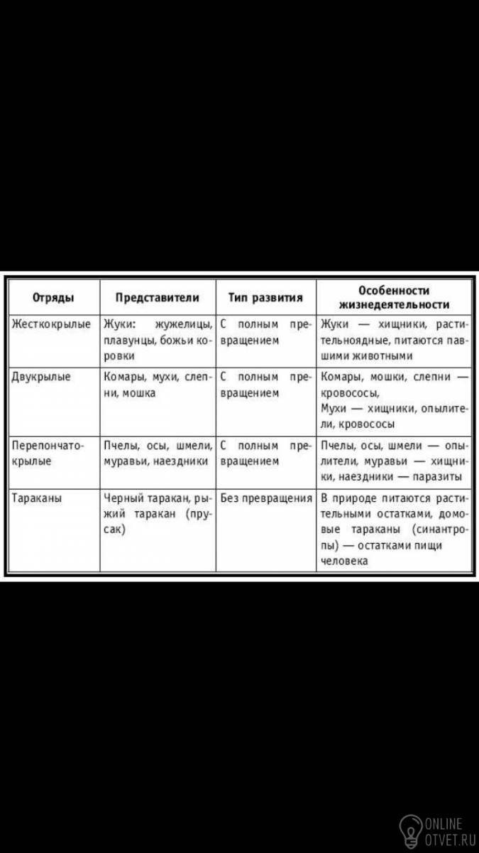 Составить таблицу по биологии отряды насекомых первый столбик отряды количество видов второй столбик характерные признаки третий столбик представители четвёртый столбик развитие с полным и неполным превращением