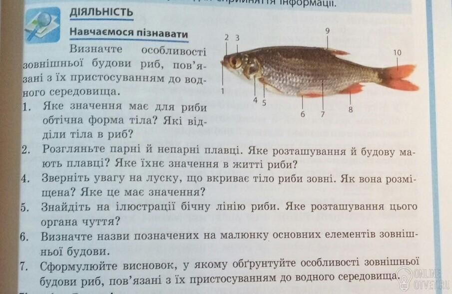 5)З боків на тілі риби від голови до хвоста тягнеться бічна лінія — це особливий орган чуттів у вигляді невеличких отворів на шкірі риби. Бічна лінія сприймає напрям і силу течії води. Завдяки бічній лінії риба не наштовхується на перешкоди і може ловити здобичі.