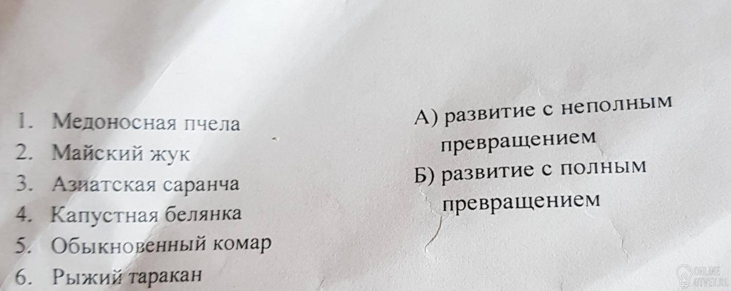 б) Развитие с ПОЛНЫМ превращением - 1. Медоносная пчела, 2. Майский жук, 4. Капустная белянка, 5. Обыкновенный комар