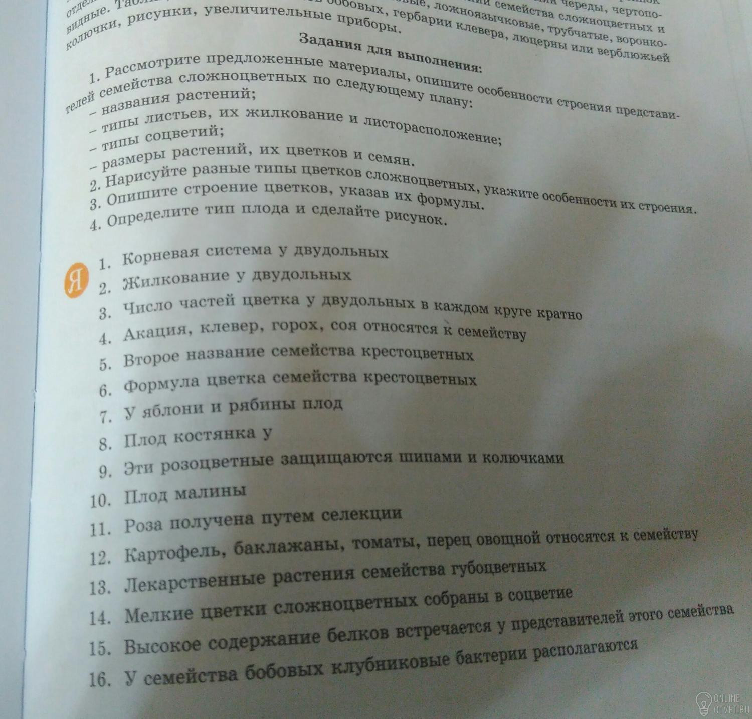 1) Стержневая корневая система2) Жилкование сетчатое3) Число частей цветка у двудольных в каждом круге кратно 54) Акация, клевер ,горох, соя относятся к семейству бобовых5) Второе название семейства крестоцветных - капустные6) Формула цветка семейства крестоцветных - Ч4Л4Т2+4П17) У яблони и рябины плод яблоко 8) Плод костянка у вишни, сливы9) Розы, шиповник 10) Плод малины многокостянка 11) Роза получена путем селекции шиповника12) Картофель, баклажаны, томаты, перец овощной относятся к семейству пасленовые 13) Мята, розмарин, чабрец, шалфей14) Мелкие цветки сложноцветных собраны в соцветие корзинка 15) Высокое содержание белков встречаются у представителей семейства бобовых16) У семейства бобовых клубеньковые бактерии располагаются на корнях в специальных клубеньках