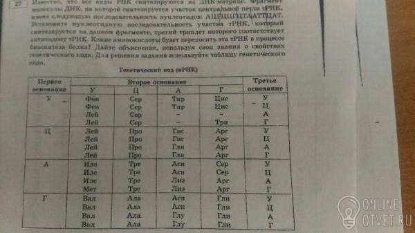 Известно, что все виды РНК синтезируются на ДНК матрице. Фрагмент молекулы ДНК, на котором синтезируется участок центральной петли тРНК имеет следующую последовательность нуклеотидов: АЦГЦЦГЦТААТТЦАТ. Установите нуклеотидную последовательность участка тРНК, который синтезируется на данном фрагменте, третий триплет которого заменен на антикодон тРНК. Какие аминокислоты будет переносить эта тРНК в процессе биосинтеза белка?