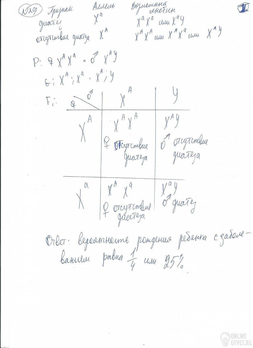 29. У человека наследственное аллергическое заболевание геморрагический диатез (нарушение процессов сворачиваемости крови) вызывается рецессивным геном (а). Аллели этого гена находятся в Х-хромосоме. Какова вероятность рождения ребенка с заболеванием (в %), если женщина здорова, но у ее отца было это заболевание. Супруг совершенно здоров.