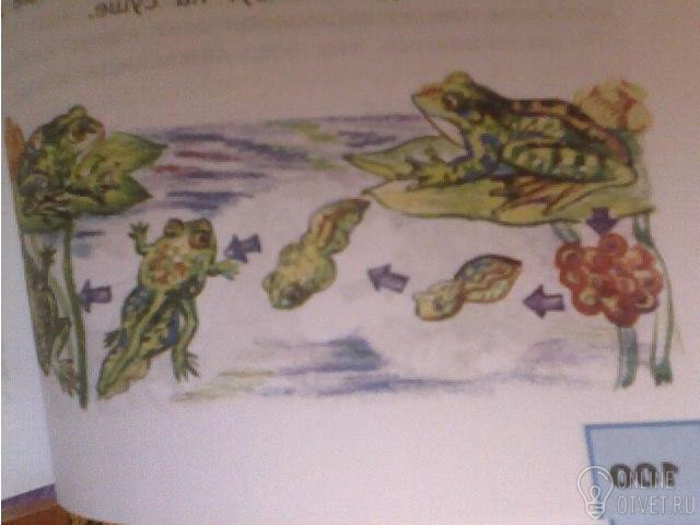 Развитие бесхвостого земноводного — лягушки: 1 — яйца; 2 — головастик в момент выклева; 3 — развитие плавниковых складок и наружных жабр; 4 — стадия максимального развития наружных жабр; 5 — стадия исчезновения наружных жабр; 6 — стадия появления задних конечностей; 7 — стадия расчленения и подвижности задних конечностей (сквозь покровы просвечивают передние конечности); 8 — стадия освобождения передних конечностей, метаморфоза ротового аппарата и начала резорбции хвоста; 9 — стадия выхода на сушу