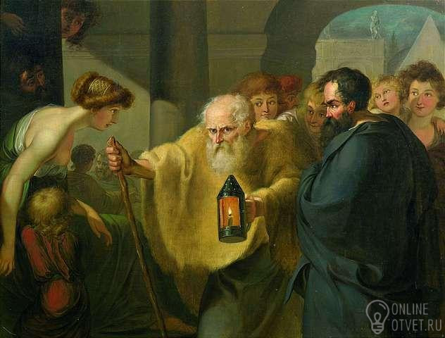 На рисунке изображена картина Иоганна Тишбейна "..искал человека". На ней в центре изображен древнегреческий философ, яркий представитель Киники- одной из наиболее значительных сократических философских школ. Известно , что этот человек ходил днем с фонарем и кричал: "Ищу человека!" Напишите в ответе только имя этого человека