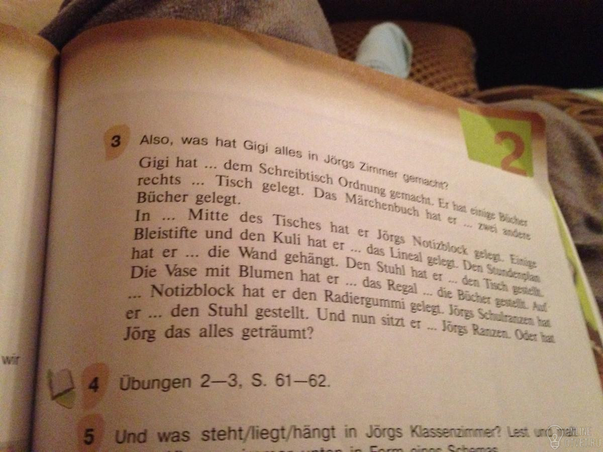 Gigi hat auf dem Schreibtisch Ordnung gemacht.Er hat einige Bücher rechts vom Tisch gelegt.Das Märchenbuch hat er auf zwei andere Bücher gelegt.In die Mitte des Tisches hat er Jorgs Notizbloch gelegt.Einige Bleistifte und den Kuli hat er an das Lineal gelegt.Den Stundenplan hat er an die Wand gehängt.Den Stuhl hat an den Tisch gestellt.Die Vase mit Blumen hat er auf das Regal über die Bücher gestellt.Auf den Notizblock hat er den Radiergummi gelegt.Jorgs Schulranzen hat er auf den Stuhl gestellt.Und nun sitz er auf Jorgs Ranzen.Oder hat Jorg das alles geträumt?