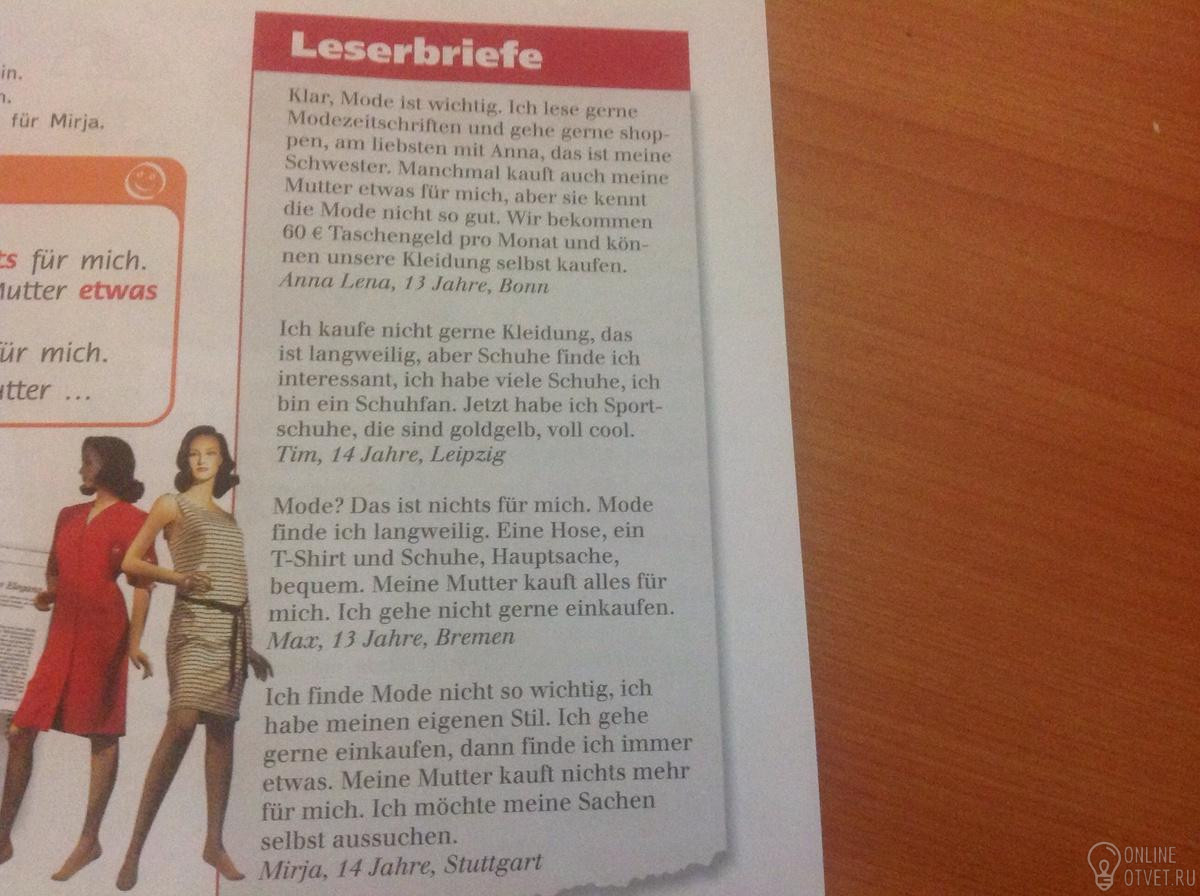 4. Мода для меня не так важна, у меня свой собственный стиль. Я охотно хожу за покупками, так как всегда что-то нахожу. Моя мама ничего не покупает мне. Я хочу сама выбирать себе вещи.