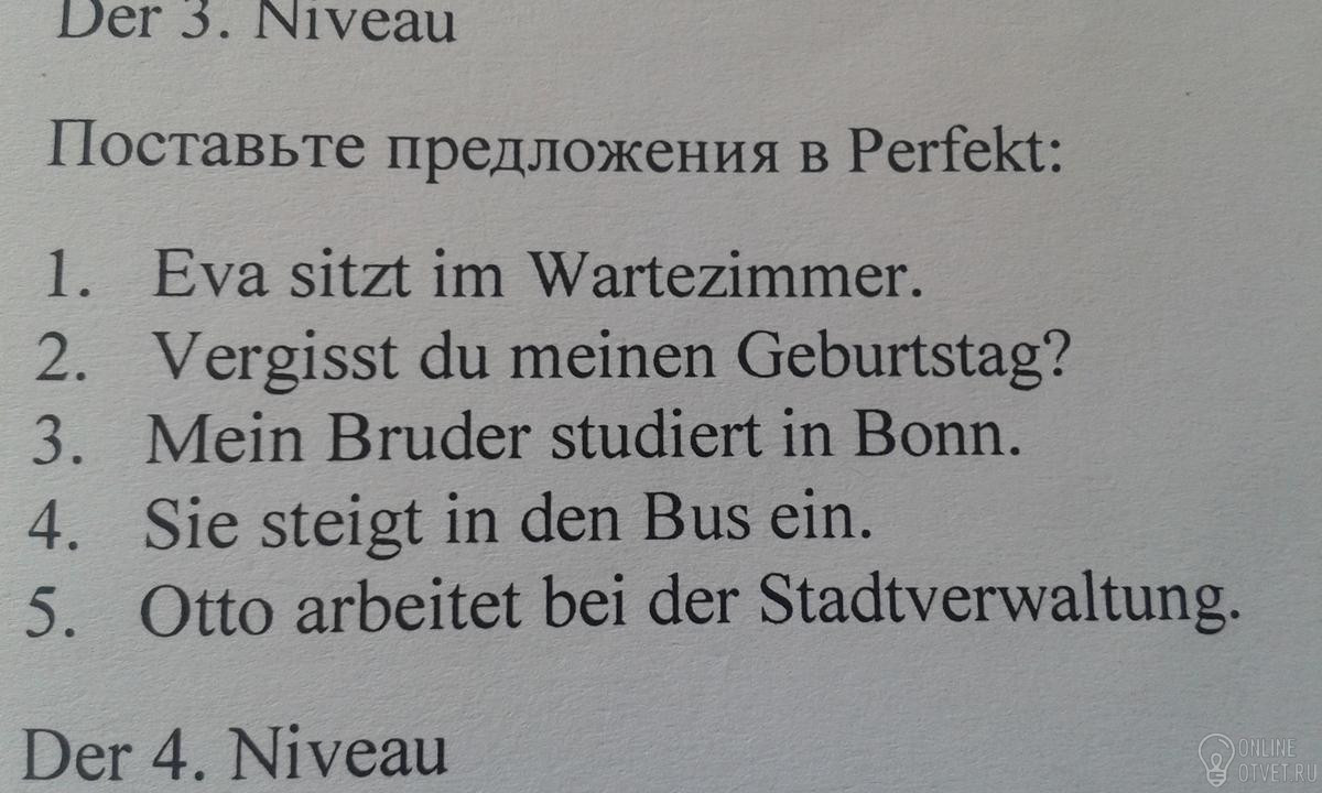 Eva hat im Wartezimmer gesessen Hast du meinen Geburtstag vergessen? Mein Bruder hat in Bonn studiert Sie ist in den Bus eingestiegen Otto hat bei der Stadtverwaltung gearbeitet