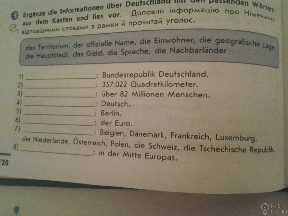 1)der offizielle Name; 2)das Territorium ; 3) die Einwohner; 4) die Sprache; 5)die Hauptstadt; 6)das Geld; 7) die Nachberla"nder; 8)die geografische Lage; (" это точки над А как в списке слов); перевод. 1) официальное название Федеративная Республика Германия; 2)территория 357,022км квадратеых; 3) жителей более 82млн человек; 4)язык немецкий; 5) столица Берлин; 6) деньги Евро; 7) соседи страны Бельгия, Дания, Франция, Люксембург, Нидерланды, Австрия , Польша, Чехословакия Республика, Швейцария. 8) географическое положение (середина ) центр Европы