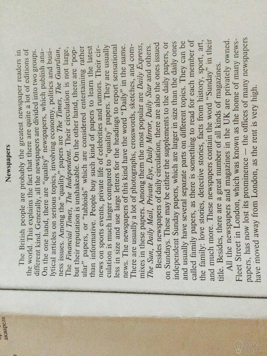 Британцы,по всей вероятности,самые большие читатели газет в мире.Это объясняет тот факт,что там выпускается довольно большое количество различных видов прессы.Вообще,все газеты делятся на две группы.С одной стороны -- "качественные" газеты,который публикуют аналитические статьи на серьёзные темы,включая экономику,политику и проблемы бизнеса.Среди "качественной" прессы: "Таймс","Гардиан","Файнэншел-таймс","Индепендент".Их тираж невелик,но их репутация непоколебима.С другой стороны -- "народные" газеты или "таблоиды",которые считаются больше развлекательными,чем информативными.Люди покупают прессу такого вида,чтоб узнать последние новости из мира спорта,личной жизни знаменитостей и слухи.Их тираж гораздо больше,чем тираж "качественных" газет.Они гораздо меньше по размеру и используют большой шрифт на заголовках для сообщения сенсационных новостей.Такие газеты называются "ежедневными".На их страницах обычно много