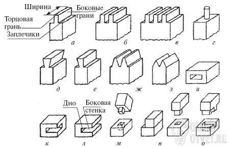 Виды шипов: а – одинарный; б – двойной: в – многократный; г – круглый; д – «ласточкин хвост»; е – односторонний «ласточкин хвост»; ж, з – зубчатые; и – гнездо; к, л – проушины; м – глухой шип; н – шип в потемок; о – шип в полупотемок.
